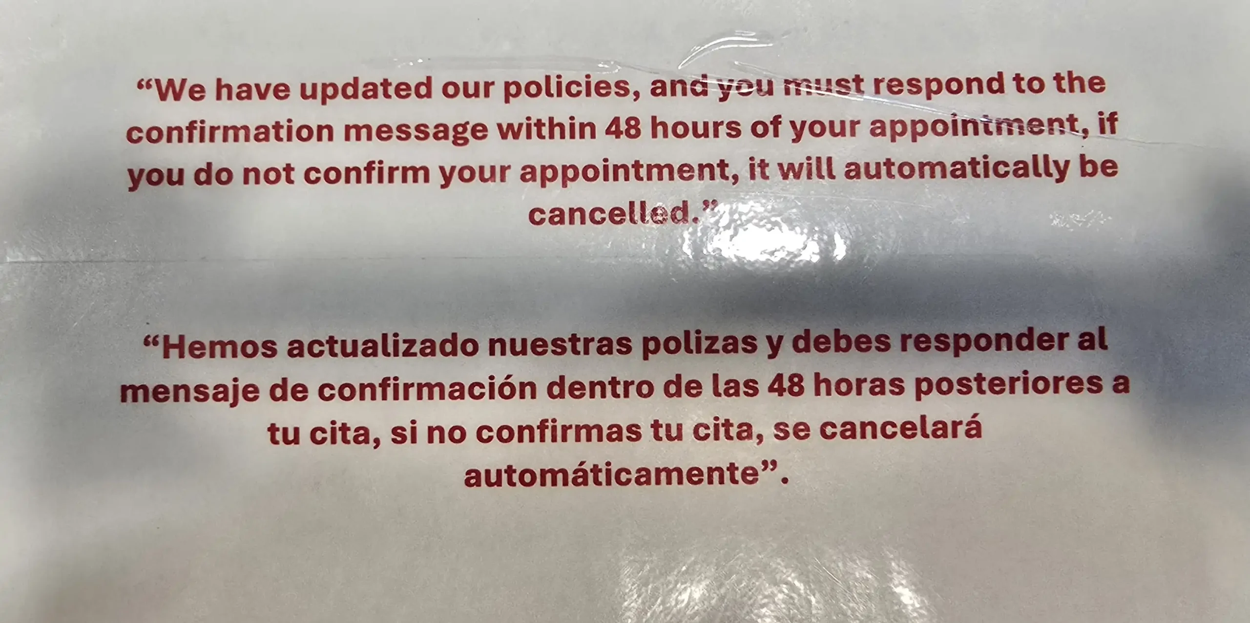 Usually they called you 2 days prior your appointment and you confirm to go or not. Suddenly and when I arrive to mi visit they told me that they policy changed and for that my appointment was Cancelled which is unfair due to they didn't send me any warn about it to my telephone or mail or any other mean